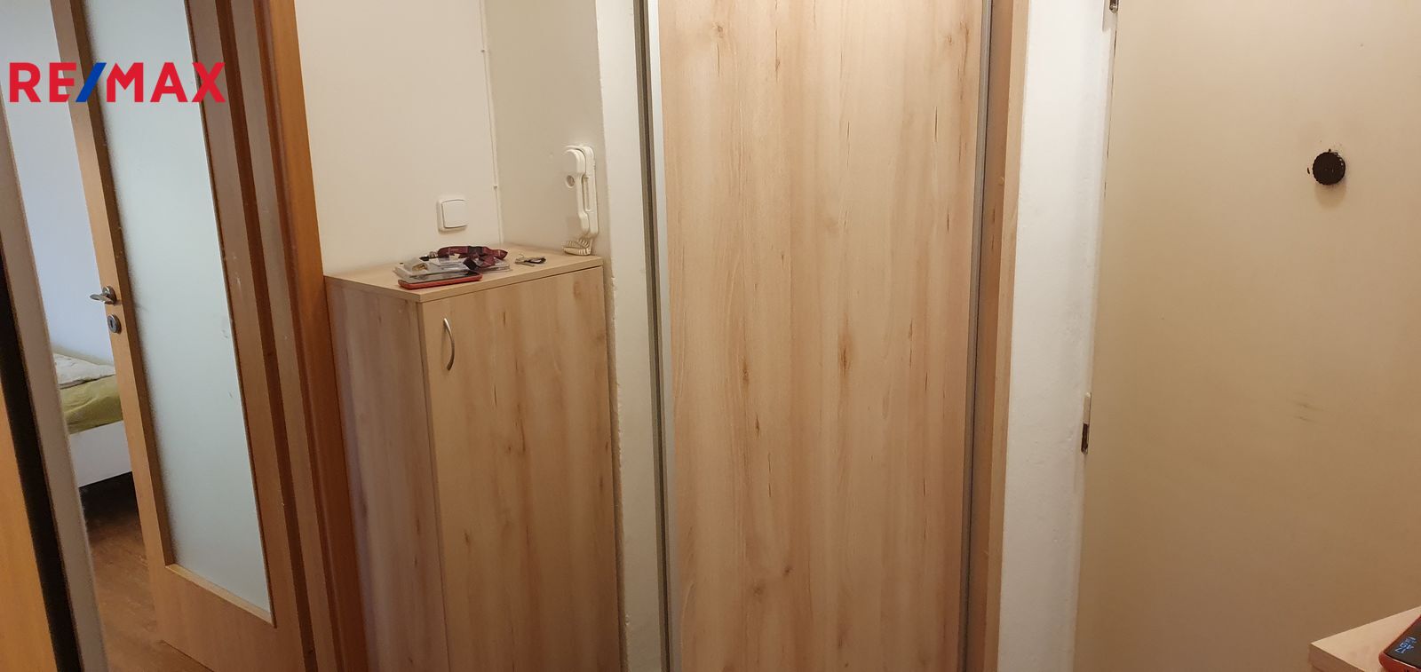 Kuchyňské linka, kombinovaný sporák, lednice, pračka. Vestavěná skříň na chodbě, v koupelně sprchový kout. Jinak je byt bez vybavení.
